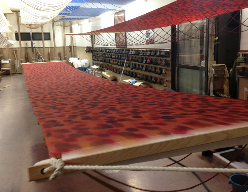 2016/07/29 22:43 帆布の引染ぼかし このところ、ご注文の帆布の引染ぼかしをただひたすら頑張っています 。 生地巾95cmに,均一に何mもぼかしていきます。絹物より生地巾が広いからぼかすのが大変ですが、そこは職人の腕のみせどころ。 一つとして同じぼかしにはなりませんが、手染めの味をだしながら同じピッチを繰り返します。 気の遠くなるような作業・・・というよりほんまに気が遠のきます(笑) 未分類