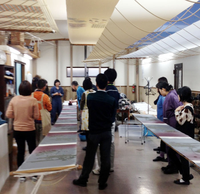 2015/11/13 10:54 今年も引染講師 今年も京都市産業技術研究所の 京友禅基礎コースが開講しています。 先日10日に15人の生徒さんと 引染の実演を弊社工房で行いました。 みなさん真剣に取り組んでおられました。 未分類