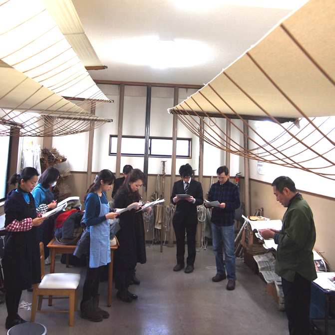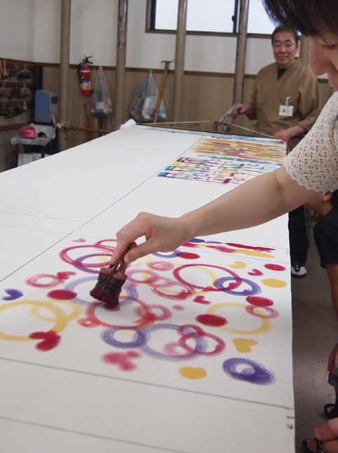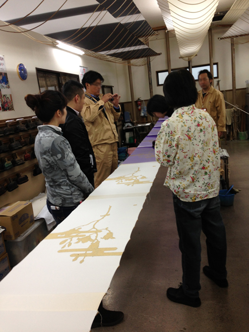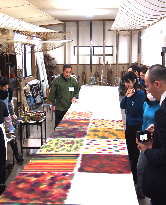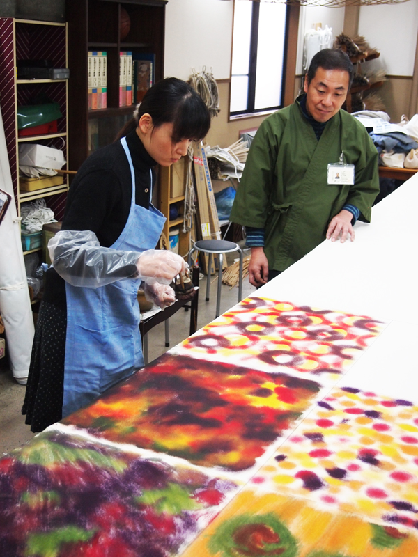 2014年1月14日 弊社の染工房にて「京もの親善大使“みやびはん”」の引染体験講習会。